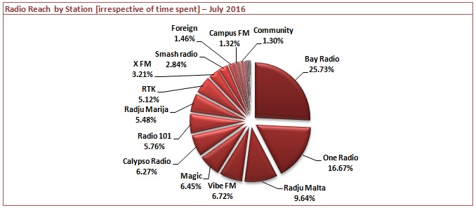 Computing audience shares by the amount of time that radio listeners have spent following each particular station, the results reveal that while Bay Radio is the most popular station in Malta, its listeners spend an average of 2.47hrs tuned in to the station whereas ONE Radio listeners spend 4.07hrs.