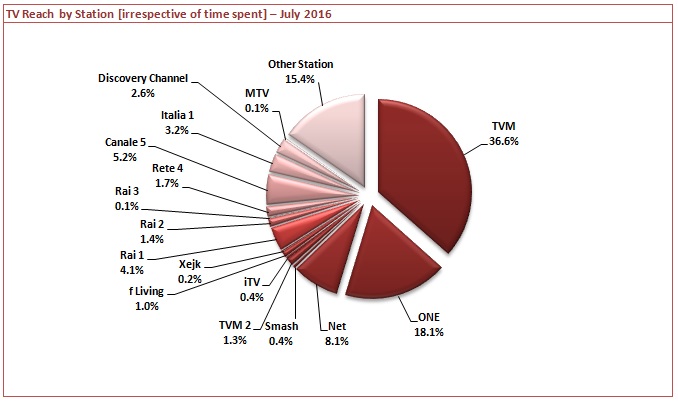 TVM remains the most popular station with 36.6%, followed by ONE [18.1%], and Net TV [8.1%]. Overall 66.2% of all viewers followed a local station while the other 33.8% followed a foreign station with Canale 5 [5.2%], Rai 1 [4.1%] and Italia 1 [3.2%] being the most popular stations.